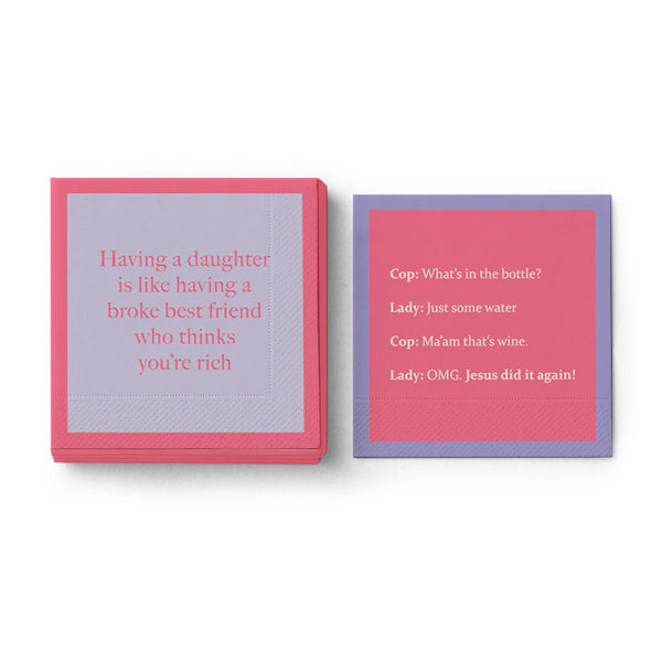 The Original Double Sided cocktail napkin has laugh out load, hilarious statements on both sides of the napkin with a fun contemporary design on the inside.